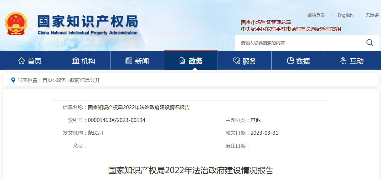 近日,国家知识产权局发布2022年法治政府建设情况报告: